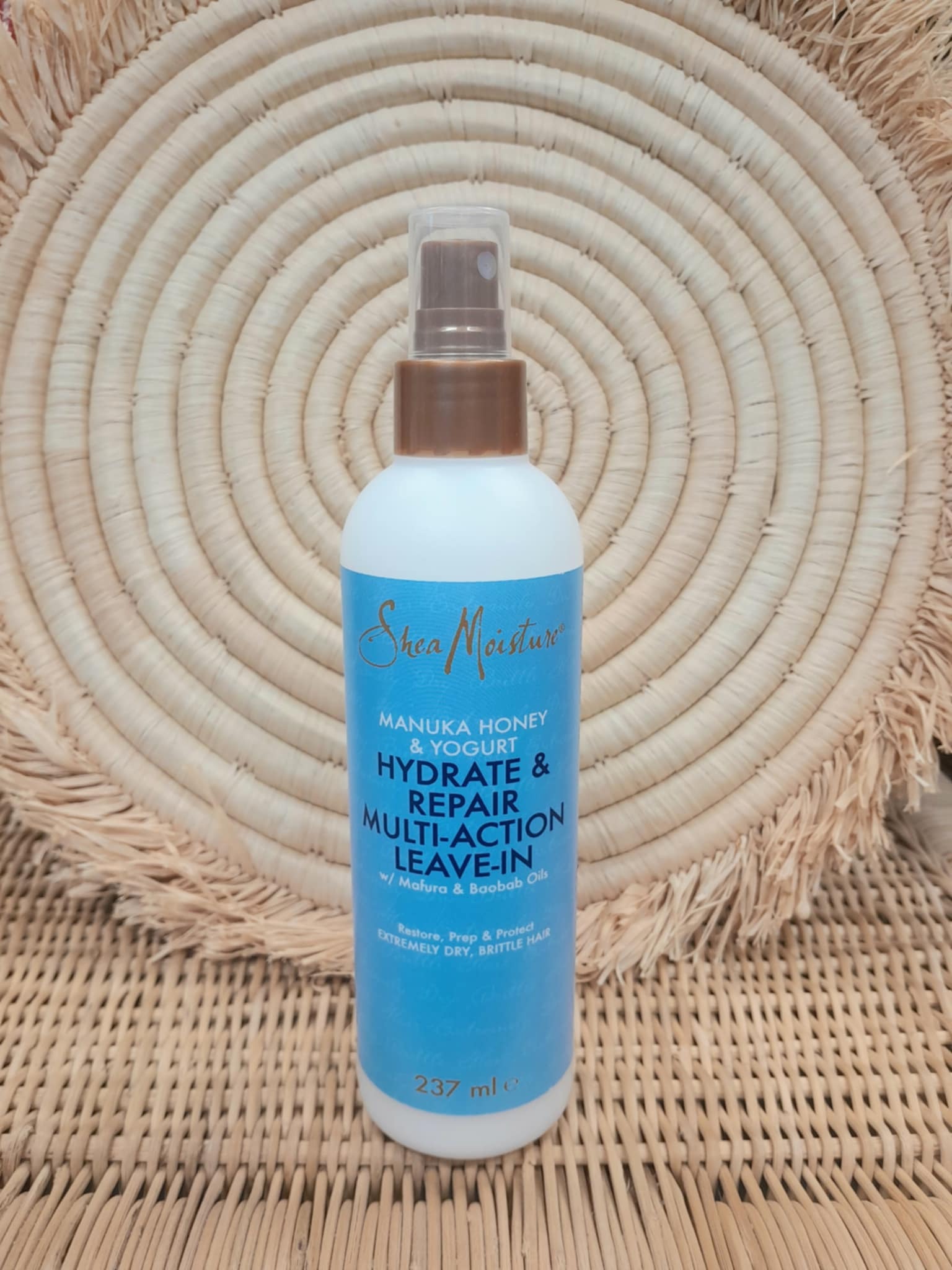 Luonnonmukainen, kosteuttava suihke kuiville hiuksille. Kosteuttaa, vahvistaa, korjaa vahingoittuneita hiuksia, pehmentää ja tekee hiukset helpommin kammattaviksi. Sheavoi, hunaja, jugurtti, viikuna, sikurijuuri, baobab-öljy, hydrolisoitu kauraproteiini. Käyttö: suihkutetaan pesun jälkeen kosteisiin hiuksiin, kammataan ja jätetään hiuksiin. 237ml. Valmistusmaa: USA. Valmistaja: Shea Moisture.