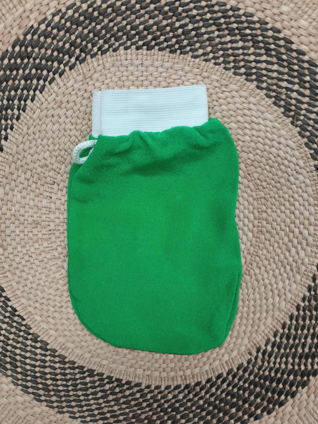 Exfoliating glove. Rough surface, exfoliates and removes dead skin cells. Can be used with soap, or shower gel and water. Exfoliating also softens the skin, allowing body lotion, or creams to absorb better. Soak in warm water before use, c.15minutes- glove gets harder. With a loop on the side of the glove, you can hang it easily anywhere. Colour: green. Material: rayon. Length: c.20cm. Width: c.14-15cm. Made in Morocco.