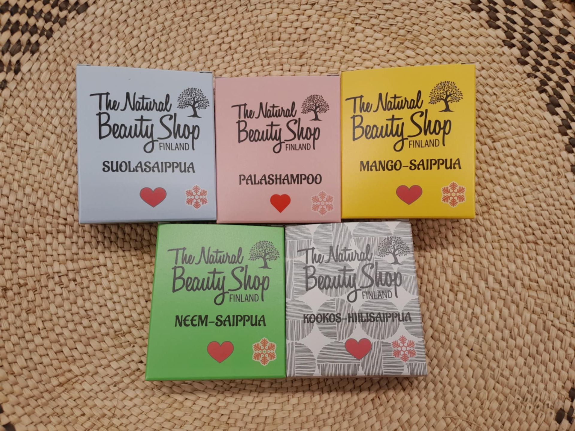 Viisi luonnonmukaista saippuaa yhdessä!(Neljä saippuaa & yksi saippuapohjainen shampoo) Ihanat, luonnonmukaiset saippuat: Mango-saippua, Suolasaippua, Neem-saippua ja Kookos-Hiilisaippua, sekä kosteuttava, hyvin pesevä Palashampoo. Valmistettu Suomessa. Valmistaja: Natural Beauty Shop Finland.